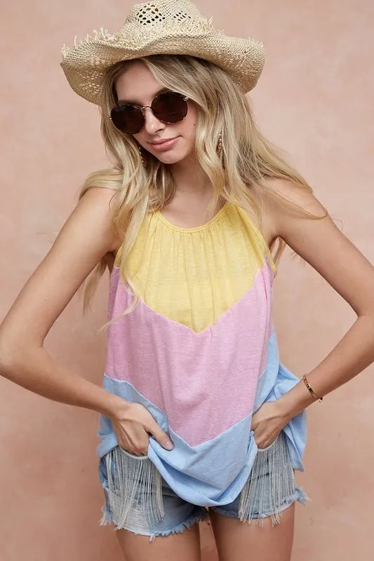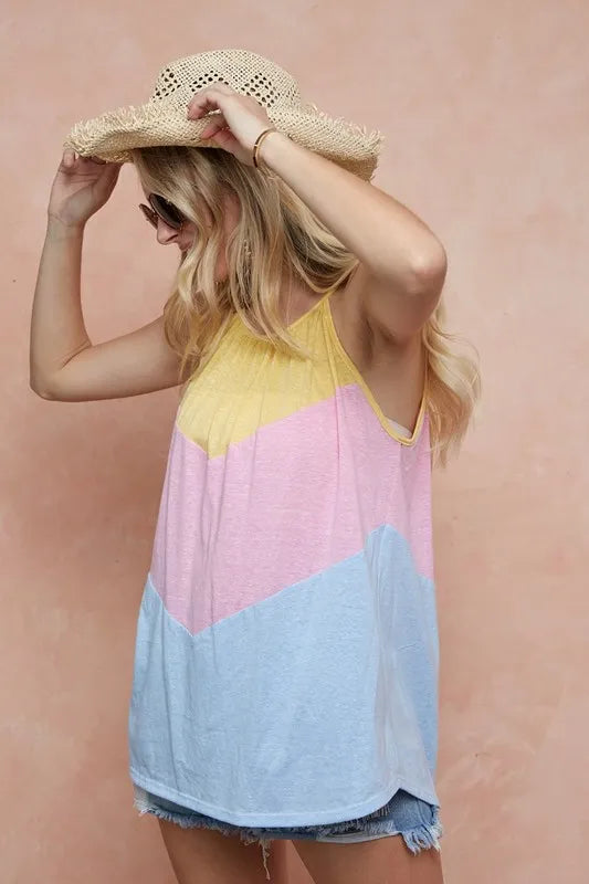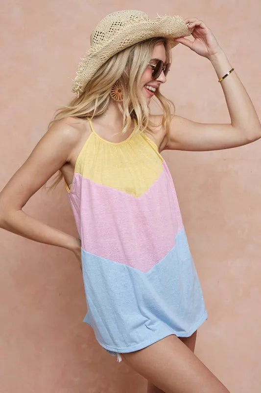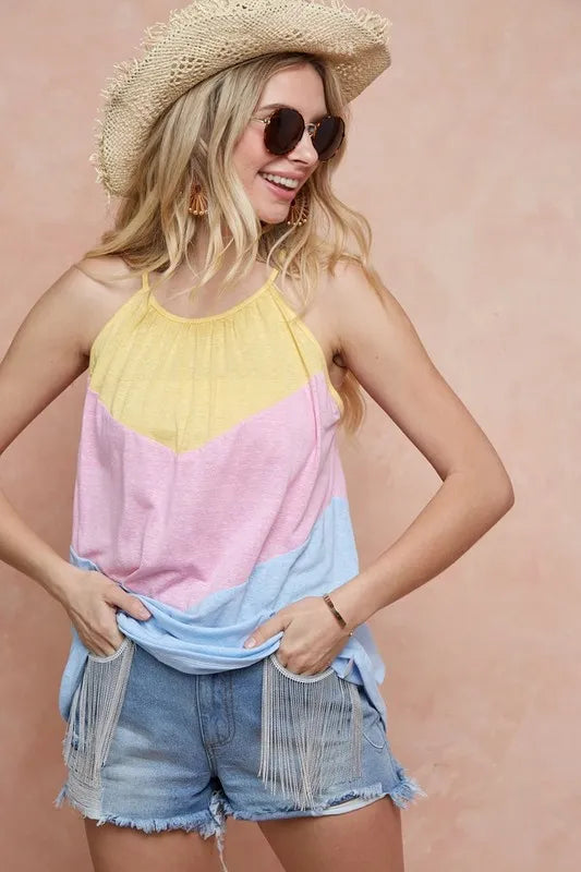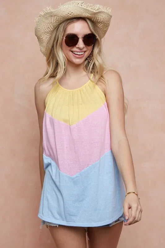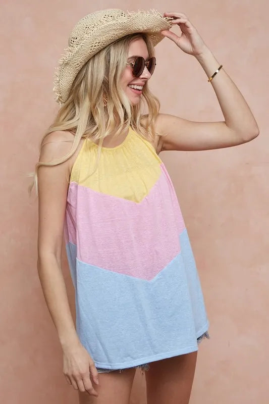 The Triblend Knit Color Block Halter Neck Top is a trendy and stylish piece that features a flattering halter neck design with a color block pattern. Made from a soft triblend knit fabric, this top offers both comfort and style. The halter neck adds a touch of elegance and sophistication to the top, making it perfect for both casual and dressier occasions. The color block detailing creates a visually appealing look that is modern and fashion-forward. Elevate your wardrobe with this chic and versatile halter neck top that is sure to turn heads wherever you go!