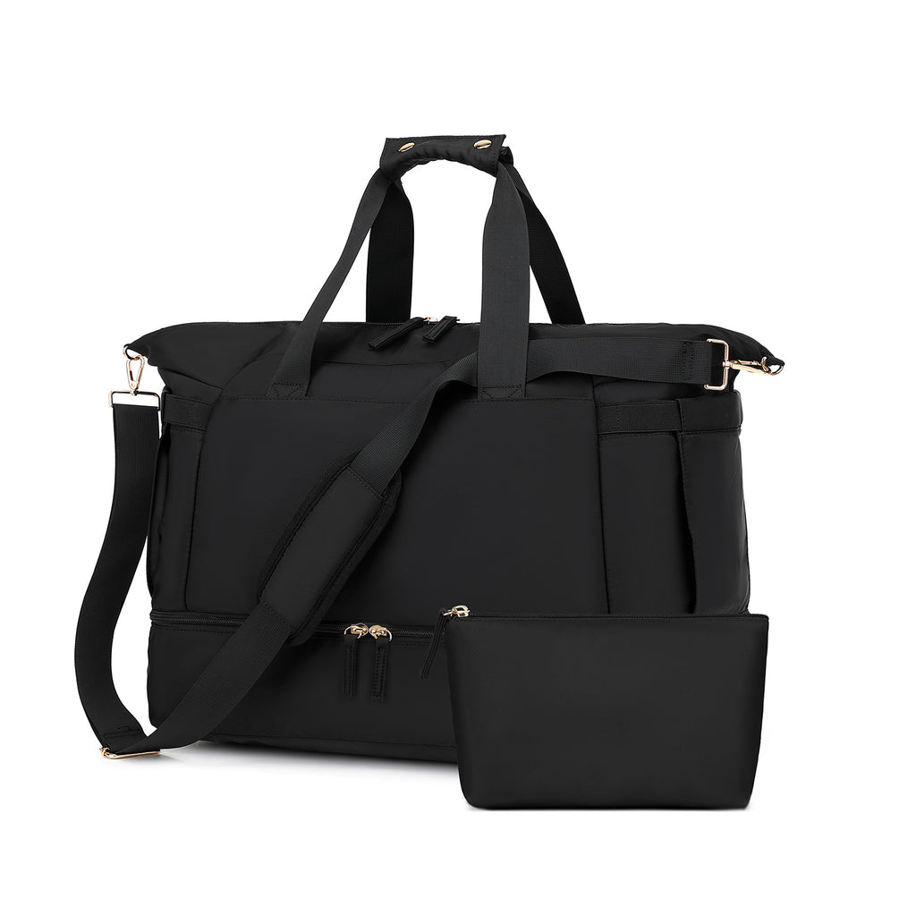 High quality polyester fabric which is durable, waterproof, tear resistant. Gym Bag guarantees the long lasting.It has many internal and external organizational pockets,which enable you have enough place for everything.With adjustable padded shoulder strap(13-20in). Overnight weekender bag can be used as Crossbody bag,Carry on bag,Tote bag,hospital bags for labor and delivery, diaper bag. Multi function duffle Bag is a perfect choice for travel, gym, school, yoga, workout,camping, hiking and daily use.