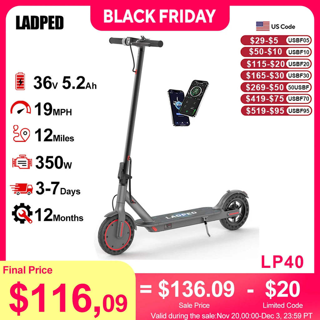 LADPED LP40 Electric Scooter 350W 19mph APP Smart Control 4 Speed Modes Foldable Electric Scooter 16miles Max Range for Adult
