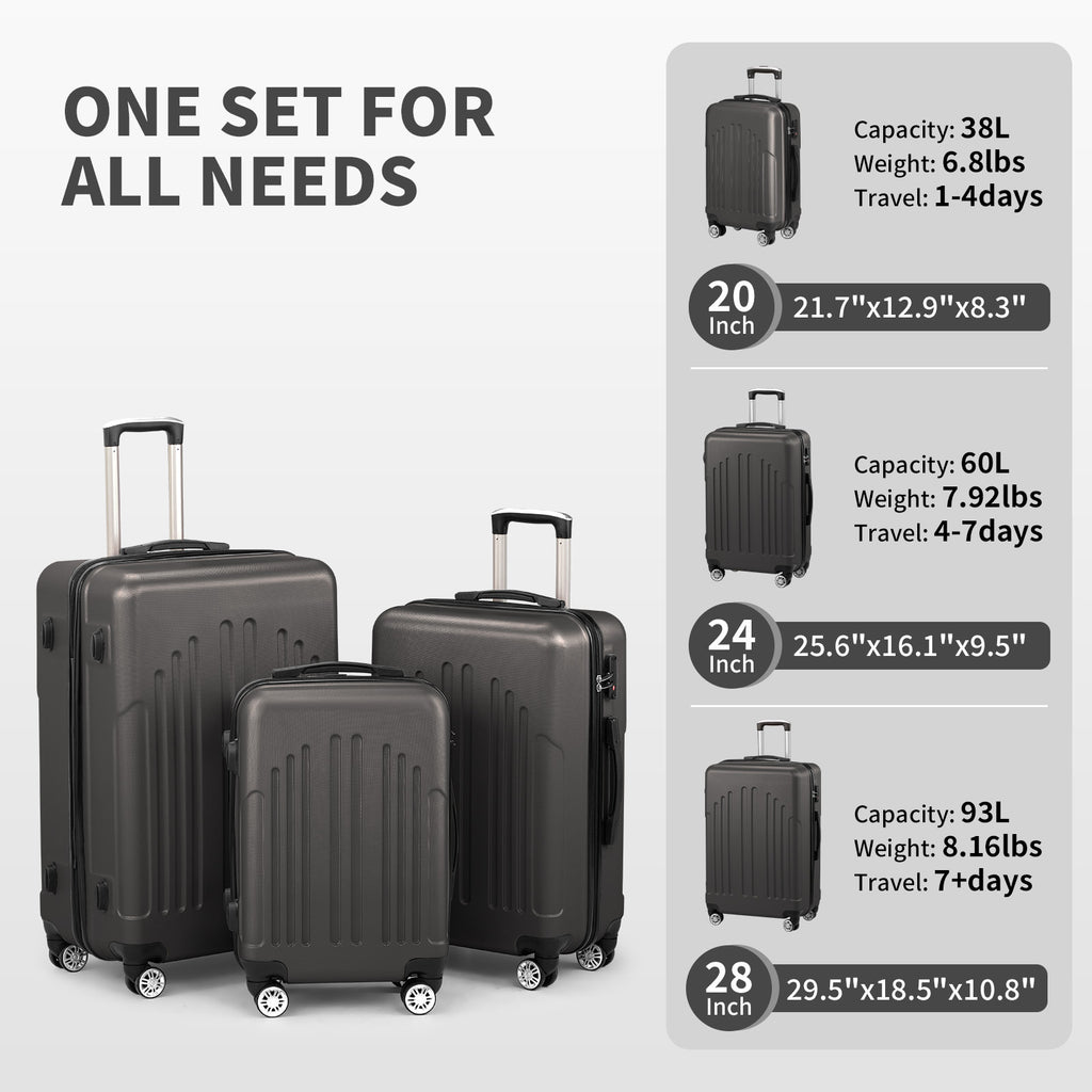 The 3-piece luggage set is made of high-quality ABS+PC material, which is durable, wear-resistant and waterproof. It comes in three sizes: 20 inches, 24 inches and 28 inches, meeting the needs of various travel scenarios.