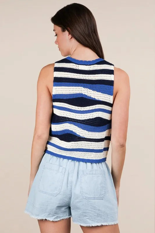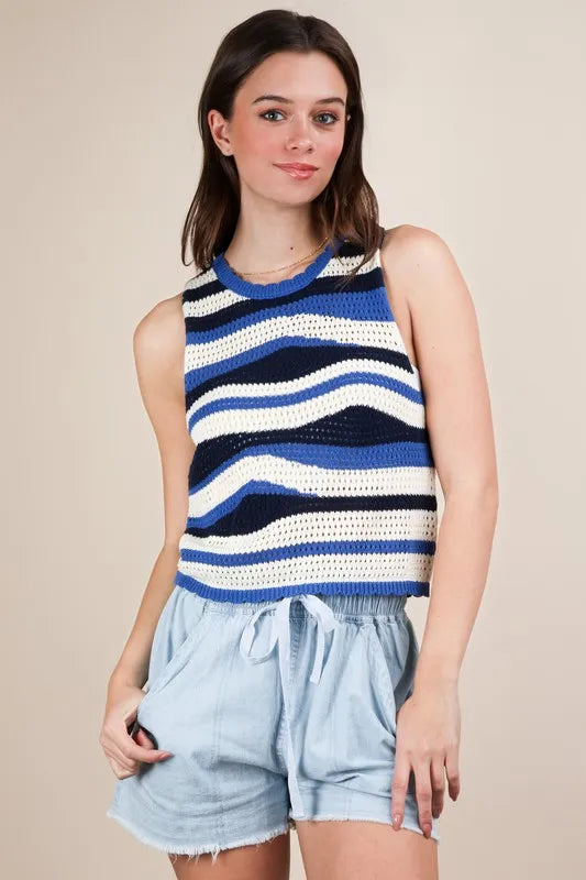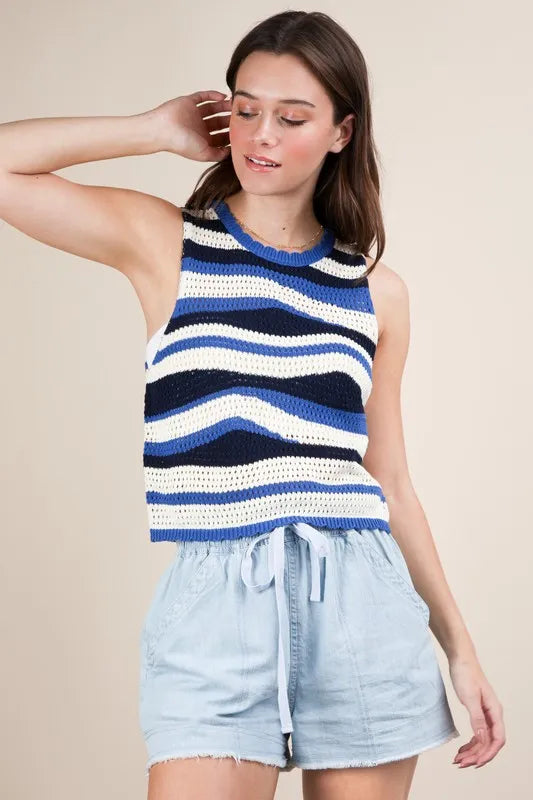 A multi-color stripe knit crop tank is a trendy and eye-catching top featuring colorful stripes in a cropped silhouette. This tank is perfect for adding a fun and playful pop of color to your outfit. The knit fabric offers a comfortable and stretchy fit, making it ideal for warm weather days. Pair this crop tank with high-waisted bottoms for a fashionable and stylish look.